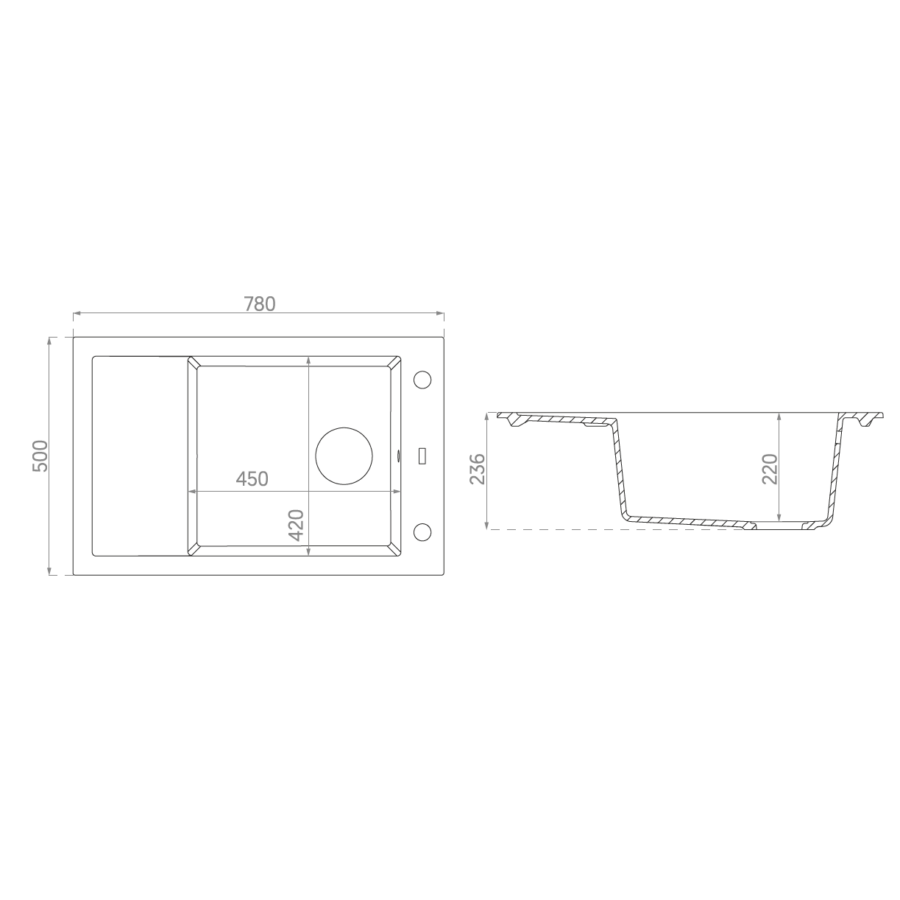 A-POINT 40 egymedencés gránit mosogató csepptálcával alapból két előre kifúrt lyukkal érkezik raktárunkba, egy a csaptelepnek a másik az automata dugóemelőnek. Az A-POINT 40 egymedencés csepptálcás gránit mosogató tisztítása nagyon egyszerű, felülete könnyen tisztán tartható, ehhez elegendő egy szivacs, és bármilyen a háztartásban megtalálható tisztítószerrel nedvesen letisztítani, (nem maró hatásúval!) majd papírtörlővel szárazra törölni.