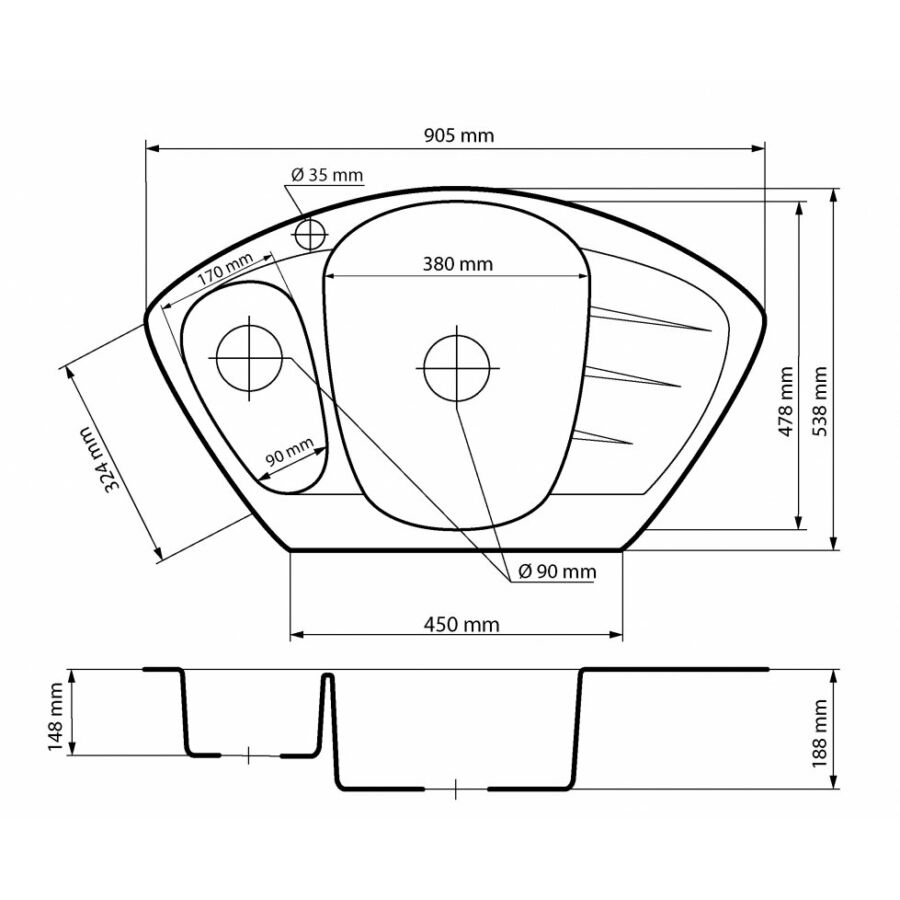 | A mosogató mélysége | 188 mm/148 mm |