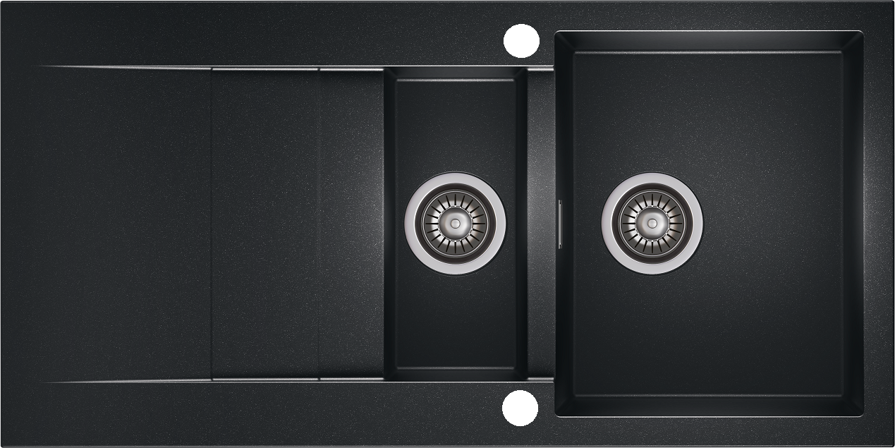 CASCADA 150 másfél medencés (gyümölcsmosós) gránit mosogató, csepptálcás kivitelben, extra mély medencével, fekete, fehér, fekete-szemcsés, bézs-szemcsés, és szürke színekben. Jobbos és balos kivitelben is használható. A CASCADA 150 másfél medencés (gyümölcsmosós) gránit mosogató min. 60 cm széles szekrénybe építhető be.