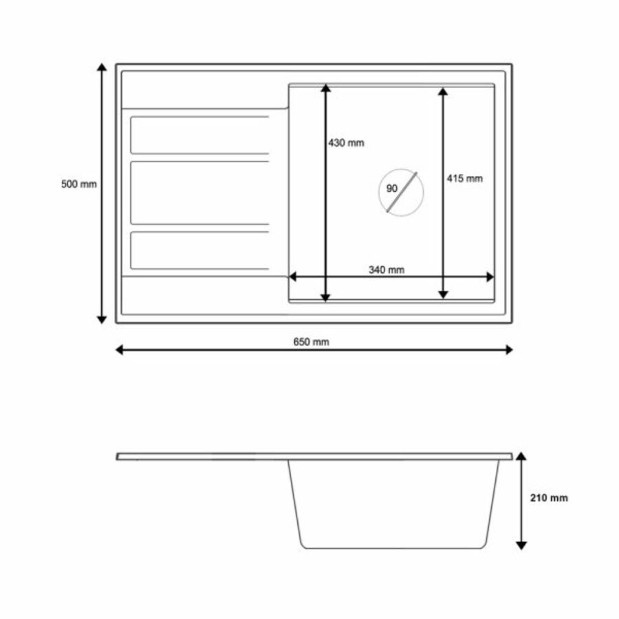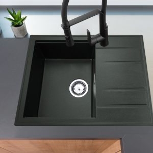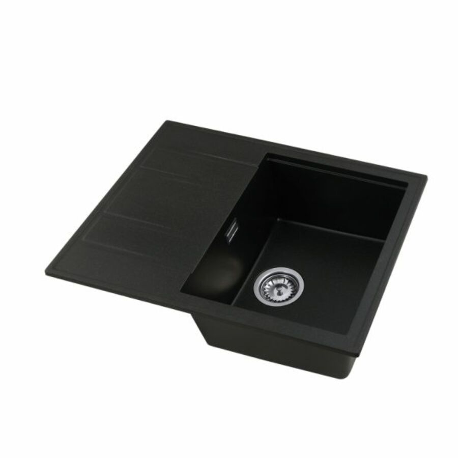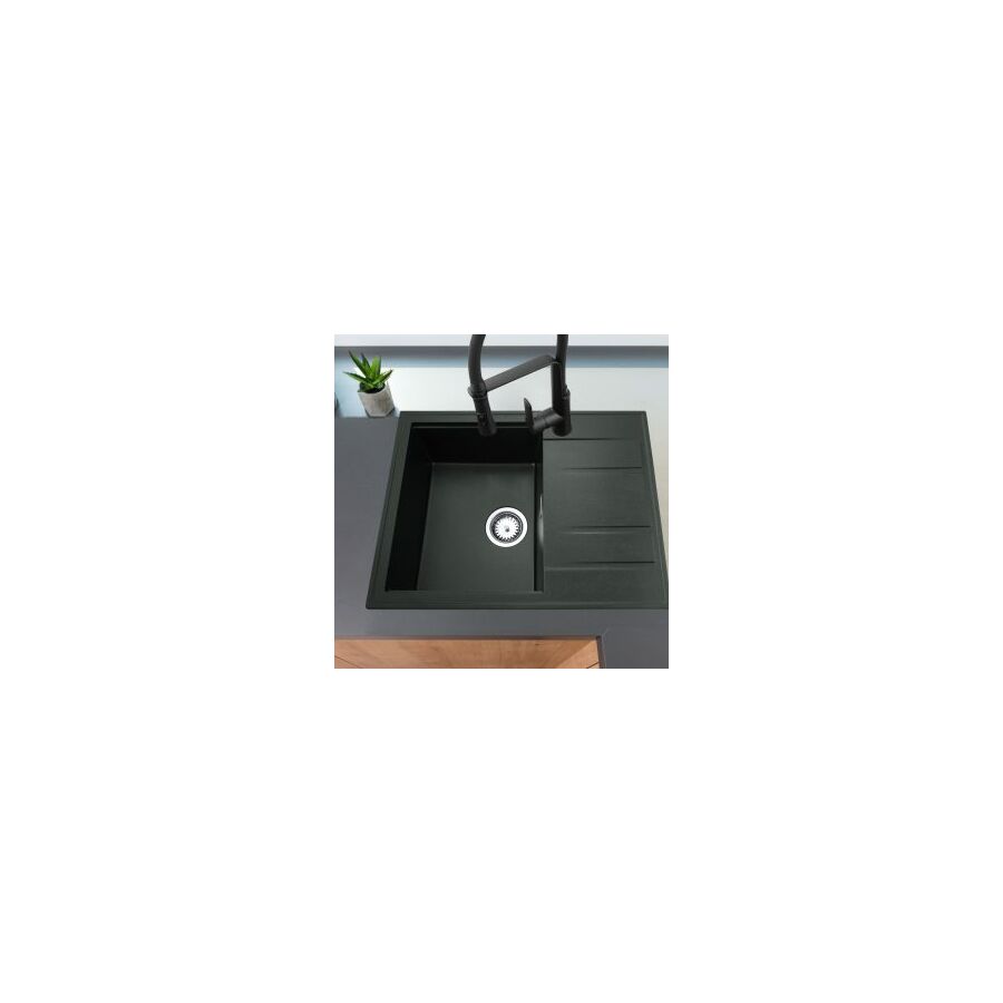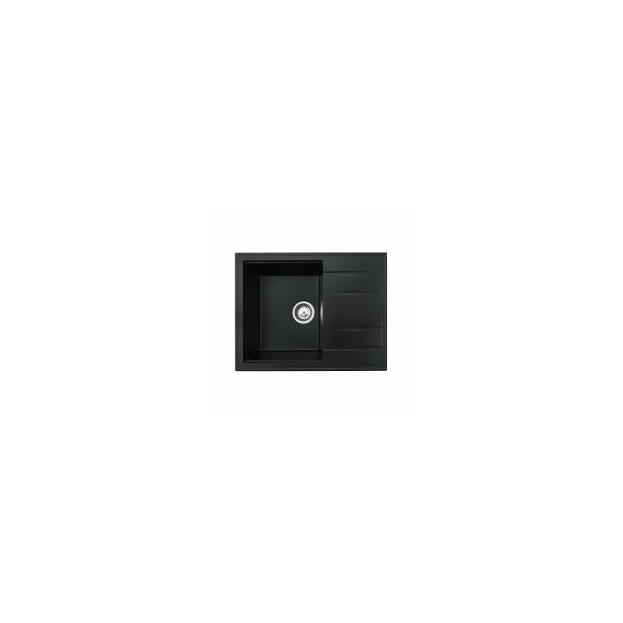 Modern 6550 csepegtetőtálcás egymedencés gránit mosogató, manuális szifonnal, fekete-szemcsés, beépíthető