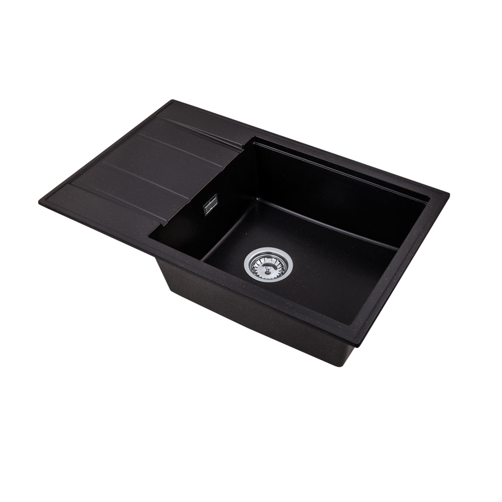 Modern 8010 csepegtetőtálcás egymedencés gránit mosogató, manuális szifonnal, fekete, beépíthető