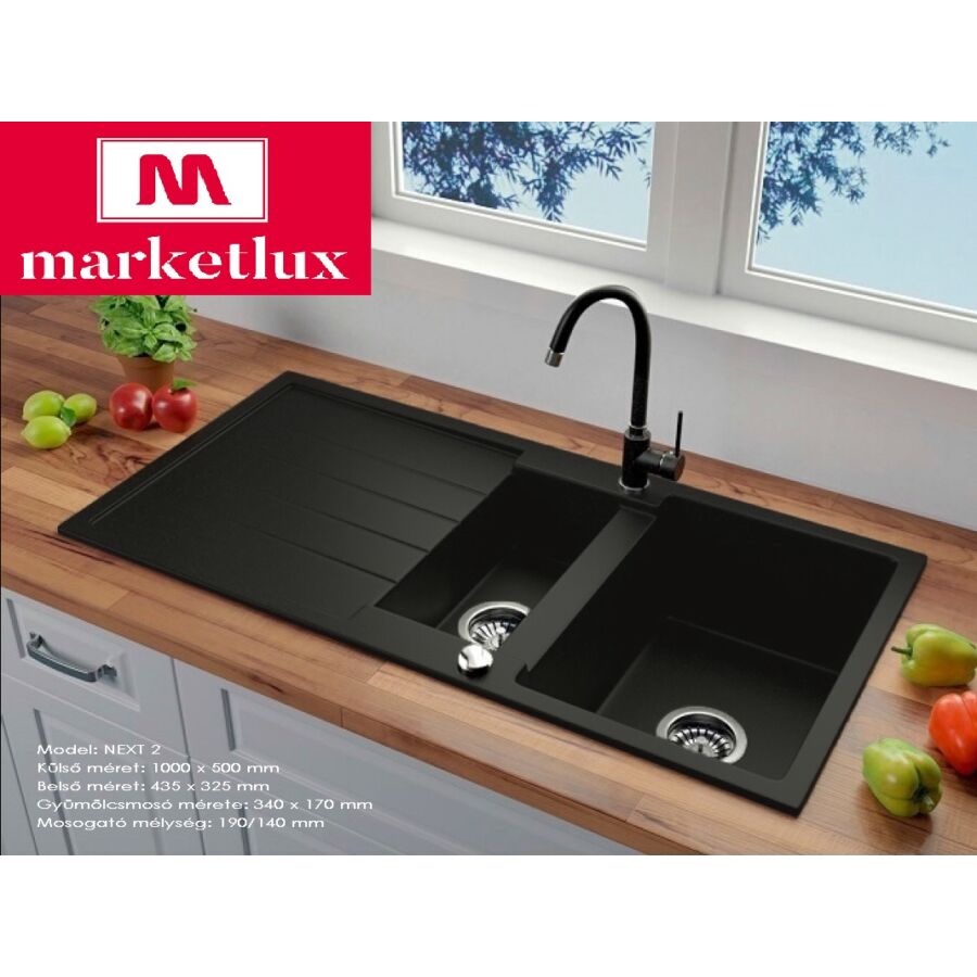 NEXT2 másfél medencés (gyümölcsmosós) gránit mosogató, csepptálcás kivitelben, extra mély medencével, fekete, fehér, fekete-szemcsés, bézs-szemcsés, és szürke színekben. Jobbos és balos kivitelben is használható. A NEXT2 másfél medencés (gyümölcsmosós) gránit mosogató min. 60 cm széles szekrénybe építhető be.