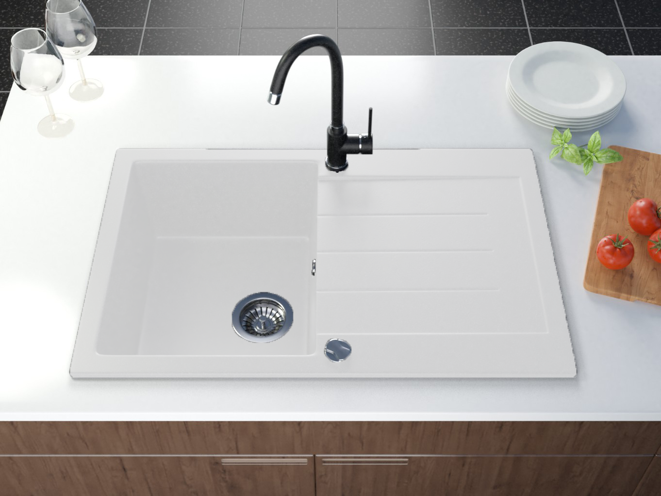 ROXY egymedencés gránit mosogató csepptálcás kivitelben, extra mély medencével, fekete-szemcsés, fekete, bézs, fehér és szürke színekben. Jobbos és balos kivitelben is használható. A ROXY egymedencés gránit mosogató csepegtető tálcával min. 50 cm széles szekrénybe építhető be.