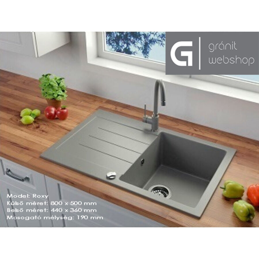 ROXY egymedencés gránit mosogató csepptálcás kivitelben, extra mély medencével, fekete-szemcsés, fekete, bézs, fehér és szürke színekben. Jobbos és balos kivitelben is használható. A ROXY egymedencés gránit mosogató csepegtető tálcával min. 50 cm széles szekrénybe építhető be.