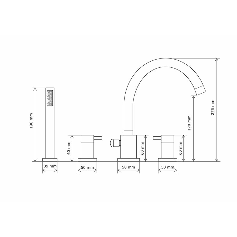 Cuadro kádtöltő csaptelep + kihúzható zuhanyfej, 3 lyukú kádra szerelhető króm